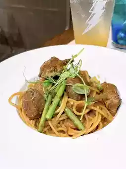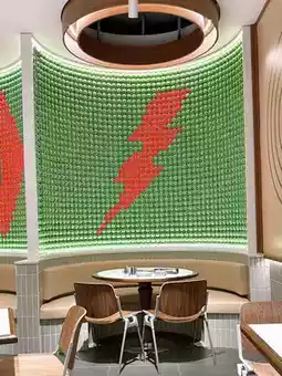 There is a photo spot inside the restaurant, which is a wall decorated with 1000 tennis balls, the middle of the restaurant is very signature lightning pattern, the whole restaurant environment is very bright, space is comfortable to sit, and next to the parking lot, parked over to eat is very convenient