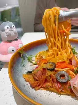 Pasta chose Napoleon sausage ham pasta🤩 The restaurant's pasta is homemade😍 It tastes bouncy and smooth, chewy 👍 Each pasta is covered with rich Napoleon sauce🤤 It tastes rich and delicious😚 The spicy sausage and large pieces of ham add more deliciousness to the pasta🥰 It's really great🌟