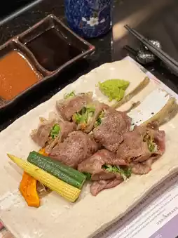 The fat is evenly distributed, and the thinly grilled beef is just right, charred on the outside and tender on the inside, with a fresh aroma of garlic slices, and a mouthful of the sweet aroma of fat. You can dip it in a little sesame sauce.