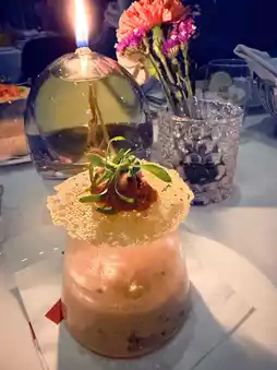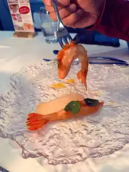 🌟Ceviche marinated prawn sashimi, tangerine honey wasabi juice