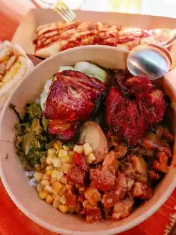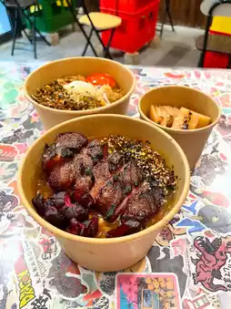 🥘Handmade Braised Pork and Slow-Roasted Chicken Chop Bento (HK$68): Slow-cooked braised pork is rich and fatty, the chicken chop is super large, served with a soft-boiled egg, pickled cabbage, cabbage, pearl rice, etc., the portion is generous