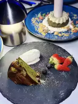The shop assistant will use a torch to burn the surface of the cake into a caramel crispy surface. The Basque cheesecake has a pistachio aroma and is paired with strawberries and blueberries. The presentation is exquisite and beautiful.