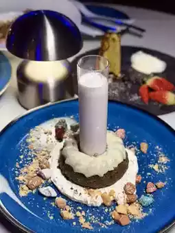 Check out the first-class dessert. The ring-shaped sesame cake looks like a small volcano, with a pink strawberry jam tube in the middle to pretend to be lava. When the tube is lifted, the strawberry jam forms a volcanic eruption scene, which is very interesting. The dessert is accompanied by cookie crumbs and rock-like candies, giving it a rich taste.