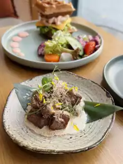 Today I finally went to a Cafe I always wanted to go to😎 The floor-to-ceiling glass windows and wooden decoration match beautifully, it is recommended to sit close to the floor-to-ceiling glass, pink-orange brick walls make the environment warm and comfortable, weekends can spend leisurely here ✌🏻