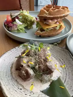 There is our favorite slow-cooked chicken breast😳 I ordered this burger because I saw it is healthier, their waffles are more dry and no oil to eat down not fat, the middle of the slow-cooked chicken breast is quite soft and smooth, it feels especially not like a traditional burger monotonous.