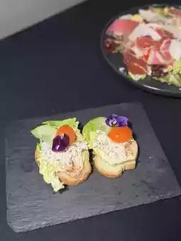 Appetizer black truffle crab meat toast🦀, there is so much crab meat! With cucumber 🥒 and cherry tomatoes, one bite is super satisfying 😍!