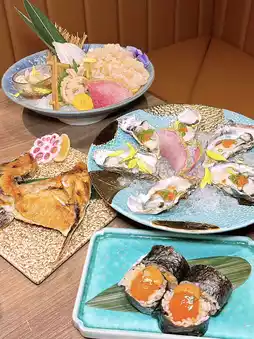 The seaweed dragon ball roll has fresh fish fillet, seaweed, soy sauce lightly marinated Japanese egg yolk, and is decorated with gold foil. This is Ikaya's signature model. It has a rich egg flavor, plus fish fillet and seaweed