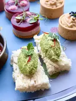 There is a range of exquisitely shaped savory and sweet refreshments.