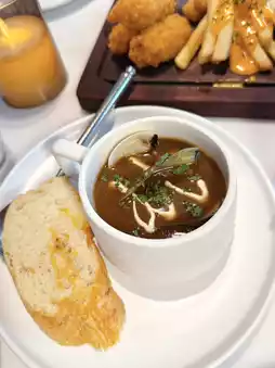 The lobster soup is savory with seafood freshness, and has a mellow texture.