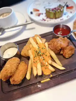 There are four snacks: cheese sauce fries, fried chicken chunks, Gillette Hiroshima oysters and Gillette fish fingers. I especially like the Gillette oysters🦪, the outer layer is fried to crispy, the inner layer of oysters retains the sweet and smooth taste. 🧀 Rich cheese sauce, with french fries and eat it all in one go. The other two snacks are also fried crispy and moderately seasoned.