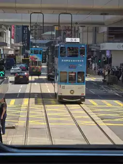 Let me tell you a little bit. To get on the tram, you have to cross to the middle of the road, where there will be 2 pairs of trams on opposite sides of the road. But the tram station is in the middle of the road. Emphasize that you must cross the crosswalk only when the traffic light is green for pedestrians because Hong Kong's traffic laws are very strict. When getting on, you may be confused about which side to get on or which tram to get on. Look for the sign for the tram going to Shau Kei Wan.
