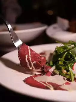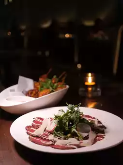 Each slice of Italian beef carpaccio has a strong aroma of black pepper and smoke, paired with rocket salad and fragrant mayonnaise, with a rich taste that is both fresh and satisfying.
