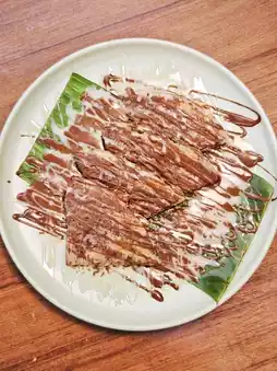 Thai street pizza with banana 🍌, condensed milk and hazelnut chocolate sauce, this combination is really evil, the toasted 🫓 pizza crust is a little crispy, the banana slices inside 😊 warm, topped with sweet condensed milk 🥛 and hazelnut chocolate sauce 🍫, really sweet!