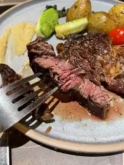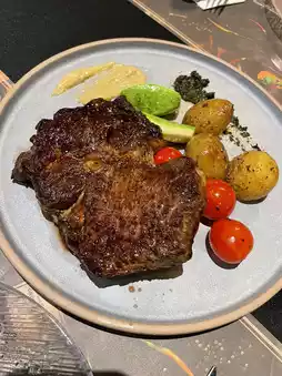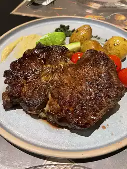 The steak portion was quite large, the ribeye steak was cooked to five percent cooked, and the juices flowed slightly when cut, and the steak was firm.
