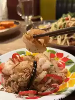 Fresh grapefruit, sandwiched with bouncy prawns, crispy coconut shreds, fried onions, sweet and sour tamarind sauce, very appetizing!