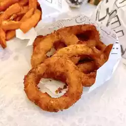 Onion rings are very cheap. There are five to six pieces in one serving. The fried flour is very thin and crispy!