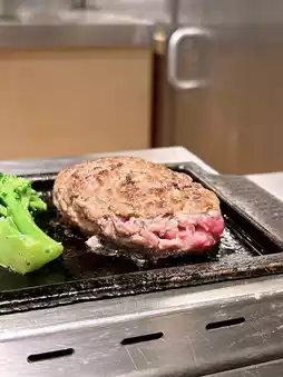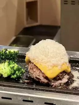 The burger steak is made with 🐮 Japanese Wagyu + American beef mixture, Japanese black hair wagyu butter is evenly distributed, the American beef will be rich in meat flavor, it tastes resilient and beefy, the shopkeeper will make 60% cooked burger steak on the iron plate and make it by yourself until fully cooked