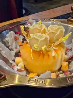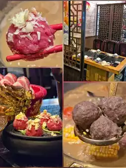 The soup is called the restaurant's new soy milk pot. The soup has smooth soy milk and fresh chicken soup, as well as large pieces of honeydew melon and dragonfish. Adding the soup creates a smoky, fairyland-like sea of flowers. The soup is very fresh and sweet because of the addition of honeydew melon. You can drink a bowl before having hot pot.