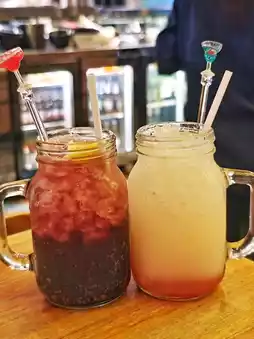 For drinks, there are many styles of 🍺 alcoholic drinks, but we chose 🍇 Jumbo Grape Soda and White Peach Lactic Acid Soda 🍑, both are so beautiful that we can't wait to drink them! 🍹 Jumbo taste bursting sweet like eating real grapes, white peach lactic acid and fruit pulp sink to the bottom, ☺️ looks very layered and good to drink.