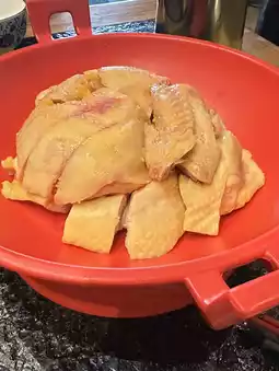 His chicken soup is very filling as always, lots of fish, we drank two bowls of soup each before starting to eat anything else, his chicken is half-cooked chicken put in the pot for 5 minutes to eat, the cooked to just right, very tender
