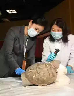 The exhibition also includes a Han dynasty ceramic coin mold unearthed in Yanglingyi, Gaoling District, Xi'an, Shaanxi Province. This mold was used to cast "Wu Zhu" copper coins, which were standardized by the central government during the Han dynasty. Another exhibit, a gold ingot, was discovered in the family tomb of Zhang Anshi from the Western Han dynasty in Fengqiyuan, Xi'an. These gold ingots were used as rewards and gifts among the imperial family and nobility.