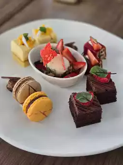 Dessert was served as a platter of beautiful ice cream, a mouthful of mango cake, chocolate cake and red throat cheesecake, plus macarons, with a mouthful of coffee, rounded out.