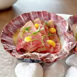 The scallops are lightly marinated with kombu oil. The taste is very fresh and fragrant. The scallops themselves are fresh and soft.