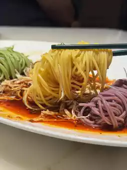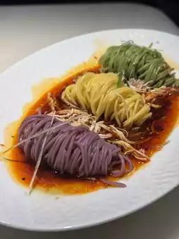 The three cold noodles are the best choice for cold noodles in the hot summer. The three cold noodles are purple, yellow and green as the theme. They are already cool. They are super delicious with tender chicken strips and soul spicy sauce