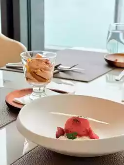 The dishes are exquisite! Enjoy the milky white decor while taking in sea views