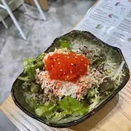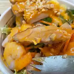 This pan-fried chicken chop is topped with fresh shrimp and pineapple, served with Chinese salad and crushed peanuts, making the overall taste richer. The refreshing taste of Thai salad dressing makes people want to have another bowl. Sushi rice with salad is both healthy and delicious, and is definitely the first choice for fitness meals.