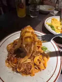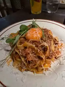 This broad egg noodle is a boon for meat lovers! 🍖 The wide noodles are very elastic, served with slow-cooked Wagyu sauce, the meat is soft and flavorful, and there is a rich tomato and red wine aroma, super delicious! Topped with Parmesan cheese🧀, every bite is rich happiness.