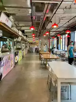 The dining environment and design here imitates Singapore's food stalls. Food is picked up in different areas, and there are self-service water dispensers and charity sale areas. The atmosphere makes people feel relaxed and comfortable, and they enjoy their meals.