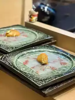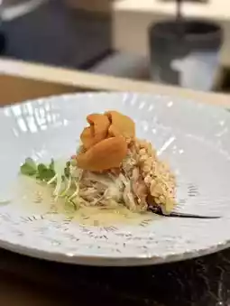 🦐 Sakura shrimp blended into a paste, topped with 🟠 sea urchin mousse and gold leaf. It’s the first time I’ve seen this dish, very unique. The flavor is smooth and rich, with a creamy texture, delicious!