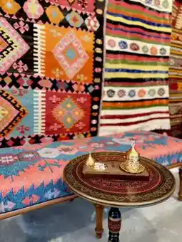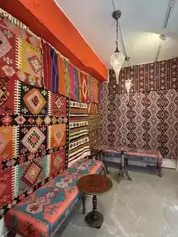 As soon as you walk in, you see the walls covered with colorful Turkish carpets, full of exotic charm! The patterns on the carpets are quite intricate, featuring geometric designs with great texture! Perfect for taking photos!