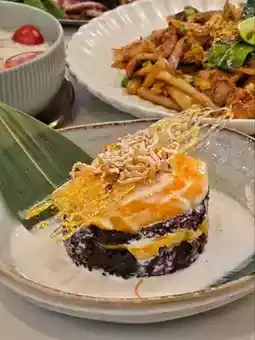 After shopping, we were hungry, and my friend wanted Thai food, so we chose this place, Ah Haan Thai. Inside the restaurant, there is a large moon-shaped light decoration that is very eye-catching. The dishes here are all beautifully plated, especially the desserts, which have a bit of a Western fusion feel.