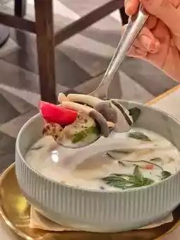 We ordered a bowl of coconut chicken soup to share between two people. The soup is fragrant with coconut milk, lemongrass, kaffir lime leaves, and other spices. It’s quite spicy, perfect for friends who like spicy food.
