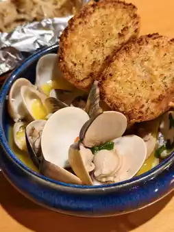 Garlic Butter Clams, thanks to the addition of lemon🍋, were not greasy at all but rather refreshing. The garlic bread served with the clams was even more surprising! Crispy on the outside and soft and glutinous inside! Plus, the garlic flavor was very strong.