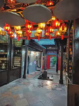 Because it was pouring rain when I arrived, the yellow light inside contrasted strongly with the blue sky outside, enriching all the color details. No filters were used, but it looked better than a natural filter. I avoided the statues of the gods where incense was burning.