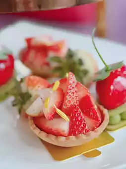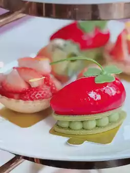 Spread with homemade strawberry jam, the sweet and tangy fruit aroma combined with smooth cream, paired with the included Ruinart Brut Rosé pink champagne 🥂 shimmering with a rose gold hue, faint berry aroma perfectly matches the desserts—just right!