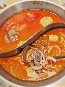 For the soup base, we chose "Spicy Satay Pot 🌶️ paired with Rich Tomato Pork Bone Pot 🍅." The satay broth is aromatic with a hint of 🥥 coconut fragrance, while the tomato base is rich and flavorful, made with genuine ingredients 👍.