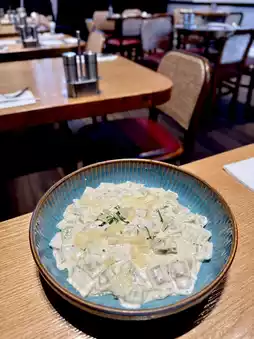 I ordered the Potato Soup and Ravioles du Royan with Truffle Sauce. The Potato Soup was rich and smooth, with a strong potato flavor, warm and comforting! The French ravioli had thin skins and delicious filling, and the aroma of the black truffle sauce was intense—truly a perfect match!