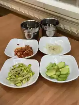 There are four types of free Korean side dishes: Korean kimchi, cold bean sprouts, Korean radish strips, and Korean cucumber, mostly refreshing and appetizing.