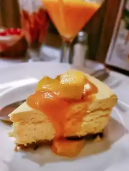 🍰 New York Cheesecake with Mango Sauce: Dense and creamy cheese flavor, with a sweet and tangy mango sauce.