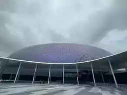 Outside the Kai Tak Main Arena, the exterior wall is made up of 27,000 triangular aluminum panels that reflect various colors like purple, blue, or silver-white depending on the light.
