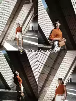 📍Cultural Centre, the evening light is nice. Between the pillars, light shines through. There’s another angle we didn’t shoot, it’s a vibe of peeking out to see people taking photos, in case anyone wants to try