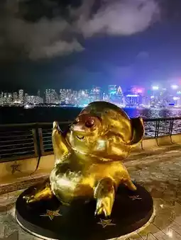 Then, to top off the night, I found one of my favorite surprises — McDull the pig! This adorable local cartoon character had his own statue, and I couldn’t resist snapping a photo with him. It added a playful and heartwarming moment to an already beautiful evening.