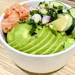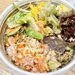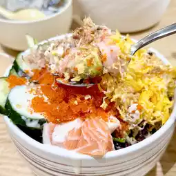 I chose brown rice and salad greens as the base. It arrived as a big bowl with very vibrant colors! The taste was a pleasant surprise, unexpectedly delicious! The salmon was rich and fatty, with crunchy crab roe. The bonito flakes, shredded egg, and avocado all paired well, and the portions of salad greens and brown rice were generous. The dressing matched perfectly, making the whole bowl very tasty!