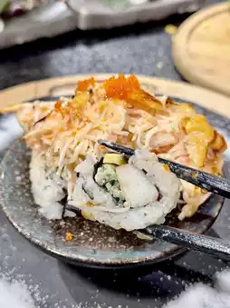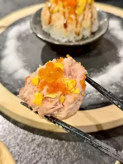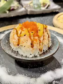 The Volcano Roll was ordered by my boyfriend, with scallops, cucumber, avocado, and crab sticks. The crab shreds are really abundant. Although the ingredients seem ordinary, the taste is exceptionally good, and the flame-grilled effect is truly Instagram-worthy! It has a bit of an icy-hot dual sensation.