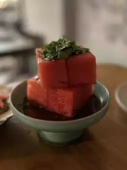 Tonight, we ordered spicy watermelon as an appetizer. The watermelon 🍉 was well chilled, paired with a spicy sauce, creating a hot and cold sensation that’s perfect as a starter for early summer weather. The second dish was crispy chicken skin senbei, where the chicken skin is grilled until thin and crispy, oily but not greasy.