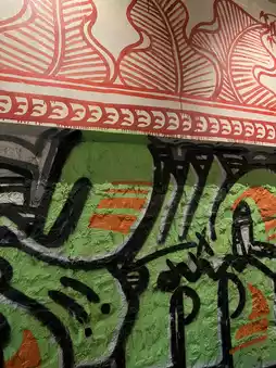 The interior features wooden furniture, warm lighting, and walls covered in graffiti, giving it a very stylish vibe.